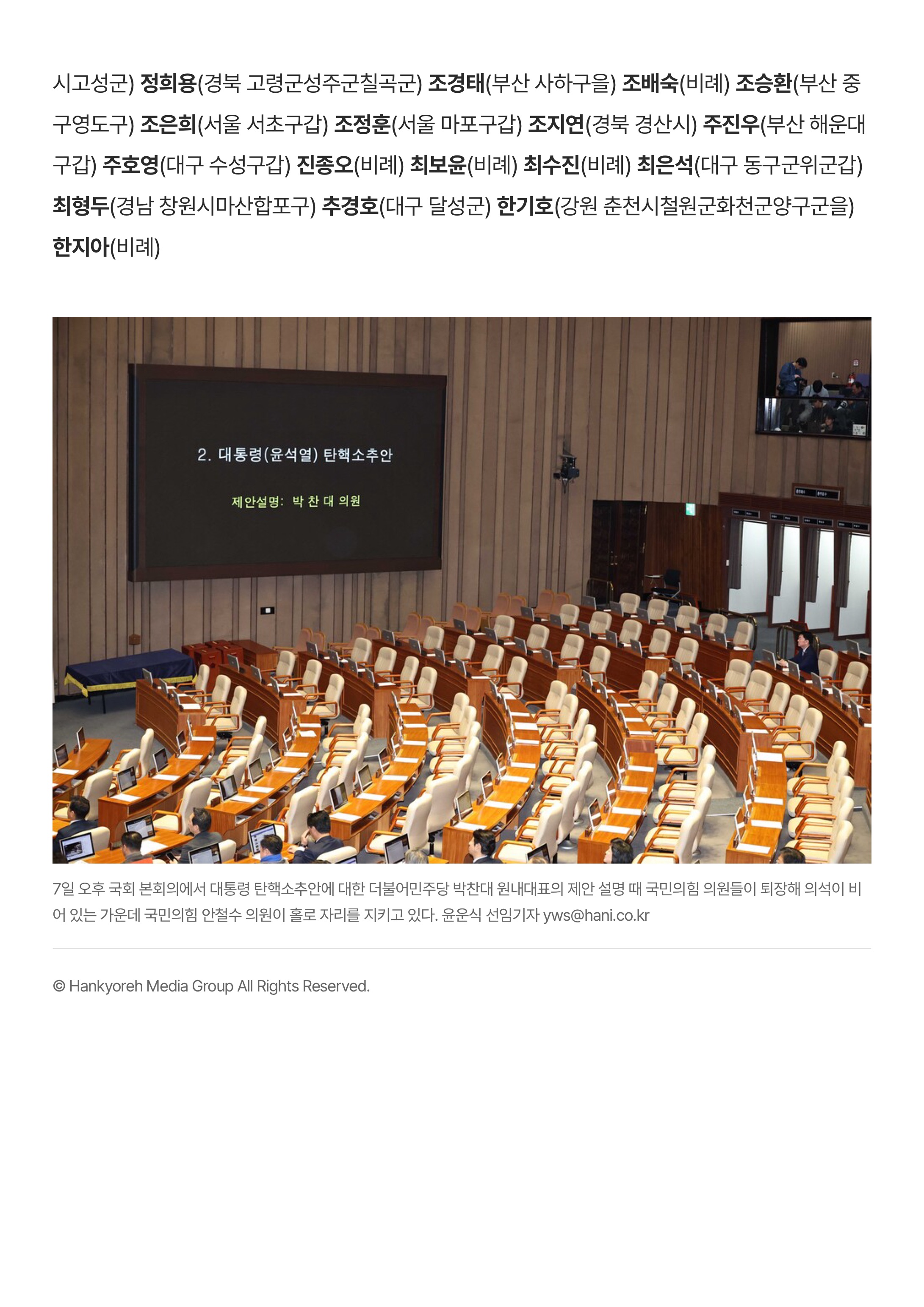 [2024년 12월9일 자 한겨레 1면] 지난 7일 오후 윤석열 대통령 탄핵소추안 국회 본회의 표결에 국민의힘 의원 108명 가운데 105명이 불참해 투표가 성립되지 않았다. 윤 대통령은 8일 내란죄 피의자로